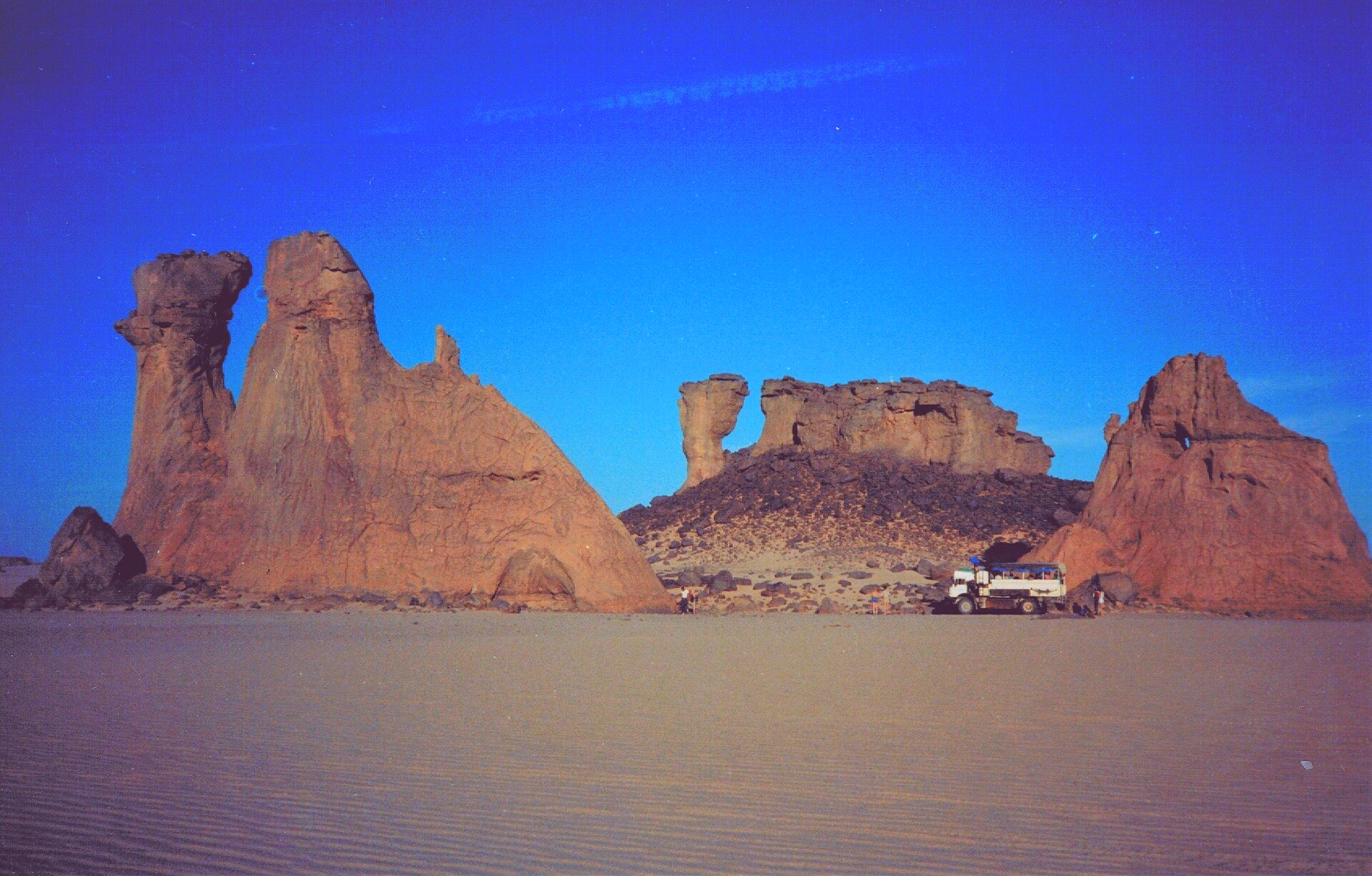 Late afternoon we passed some elephant rocks, grey and wrinkled like hide, where we did a huge “U” turn, Kelvin having decided the multiple tracks were heading in the wrong direction. Did another U-turn after the ground softened beneath us. Eventually took the bit between our teeth and headed off again, camping, lost, beside an incredible rock formation suggestive of Gorome (Turkey).