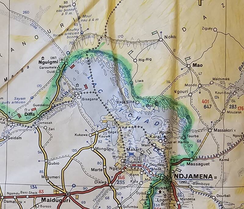 We spent the afternoon grinding our way up hills, only to look down into another valley and across another hill. Stanley was a trooper, and our sand-matting tally from Bol finished at 13 - and with a damaged gearbox - while EO totalled 48! One matting session was frightening, with the Douglas truck and ours listing badly to one side and threatening to topple as we drove along an old lakebed. Stanley first and then the Douglas truck, we ran and threw mats under the truck while dodging the sliding rear wheels, finally making it after a strenuous heart in the mouth haul. And just in time to see the EO truck approach the lake and then bog too far out for us to help. Continuing on our way, we wondered how long it would take them to get free.